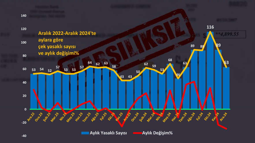 Merkez Bankası’nın verileri 2024’ün ilk çeyreğinde (Ocak-Mart) 171 kişinin; ikinci çeyreğinde (Nisan-Haziran)167 kişinin; üçüncü çeyreğinde (Temmuz-Eylül) 240 kişinin ve dördüncü çeyreğinde (Ekim-Aralık) 268 kişinin “çek kullanmaktan men edildiğini” gösteriyor. Veriler her ay ortalama 70,5 kişinin yasağa düştüğüne işaret ediyor.