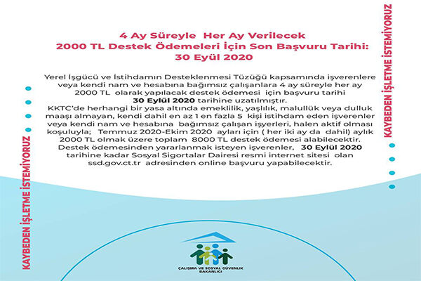 Çalışma ve Sosyal Güvenlik Bakanlığı’ndan verilen bilgiye göre, KKTC’de herhangi bir yasa altında emeklilik, yaşlılık, malullük veya dulluk maaşı almayan, kendi dahil en az 1 en fazla 5 kişi istihdam eden işverenler veya kendi nam ve hesabına bağımsız çalışan işyerleri, halen aktif olması koşuluyla; Temmuz 2020-Ekim 2020 ayları için (her iki ay da dahil) aylık 2000 TL, toplam 8000 TL destek ödemesi alabilecek.