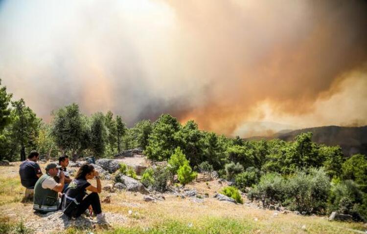 Mahalle sakinleri ise, kara yoluna kadar ilerleyen yangına müdahale etmek için elektrikli ağaç kesme makinesiyle ağaçları keserken, tırmıklarla da topraktan set oluşturuyor. Yaşanan orman yangınlarından dolayı ilçe merkezinin üzerini duman bulutları kapladı. Yangını söndürmek için havadan müdahale eden helikopterler ise dumanlar arasında gözükmezken, güneş ise kızıla döndü.