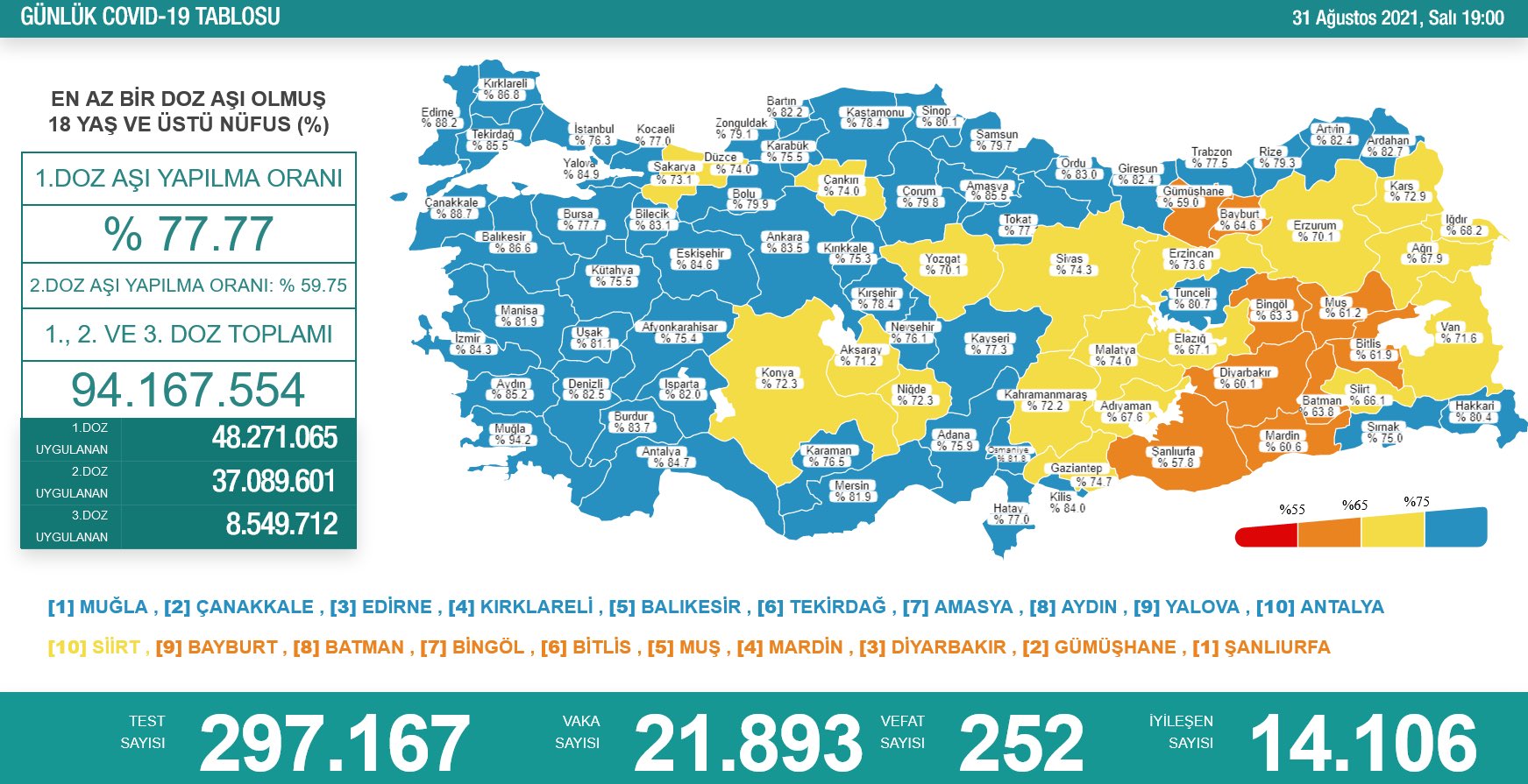 Türkiye Sağlık Bakanlığı bugün 21 bin 893 yeni vakanın tespit edildiğini açıklayarak, 252 kişinin vefat ettiğini ve 14 bin 106 kişinin iyileşerek taburcu olduğunu kaydetti.