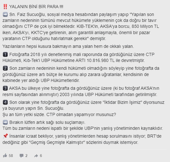 “Fotoğrafta 2018 yılı denetlenmiş mali raporunda da gördüğünüz üzere CTP hükümeti, KIB-TEK’İ UBP hükümetine artı 10.816.980 TL ile devretmiştir.