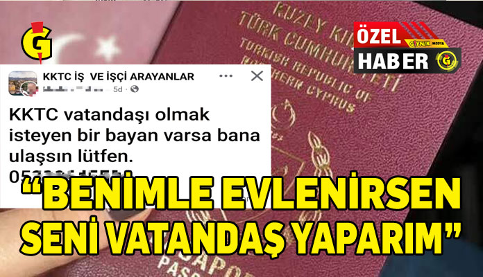 Kuzey Kıbrıs Türk Cumhuriyeti’nde sosyal medya üzerinden yapılan bir paylaşım şaşkınlık yarattı. Bir erkek Facebook kullanıcısı, KKTC vatandaşı olmak isteyen kadınlara çağrıda bulunarak, kendisiyle iletişime geçmelerini istedi. Paylaşımda açık bir şekilde telefon numarasını paylaşan kullanıcı, kendisini ilanla ilgilenen bir kişi gibi arayan GIYNIK gazetesi çalışanına vatandaşlık için evlilik teklifinde bulundu.