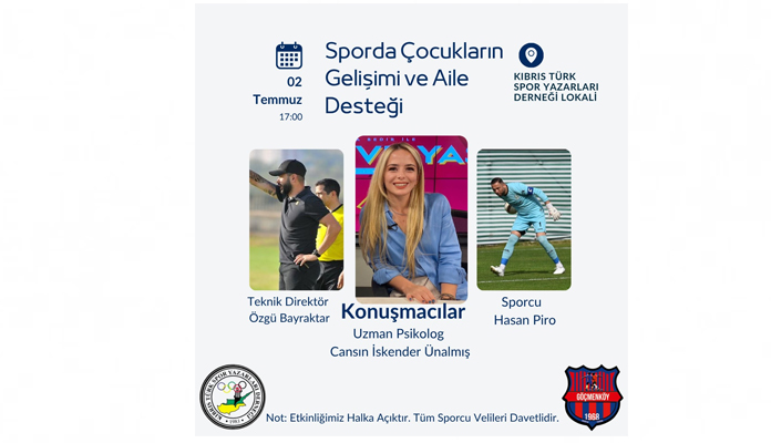 Kıbrıs Türk Spor Yazarları Derneği (KTSYD) eğitim faaliyetleri çerçevesinde, Göçmenköy Spor Kulübü iş birliğinde “Sporda Çocukların Gelişimi ve Aile Desteği” konulu seminer düzenleyecek.