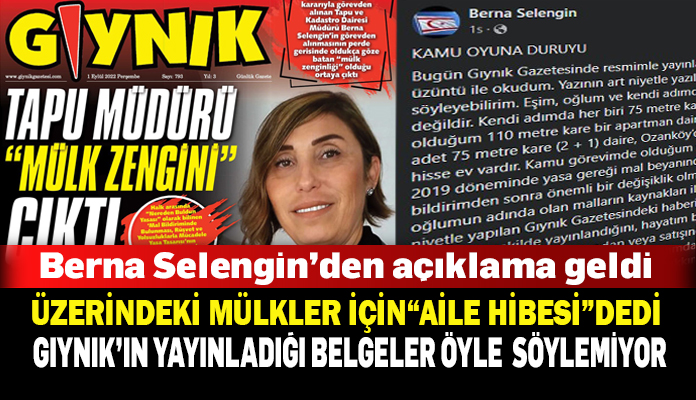 Gıynık Gazetesi’nin bugün manşetine taşıdığı “Tapu Müdürü Mülk Zengini Çıktı” başlıklı habere yönelik, odaktaki isim Berna Selengin’den açıklama geldi.