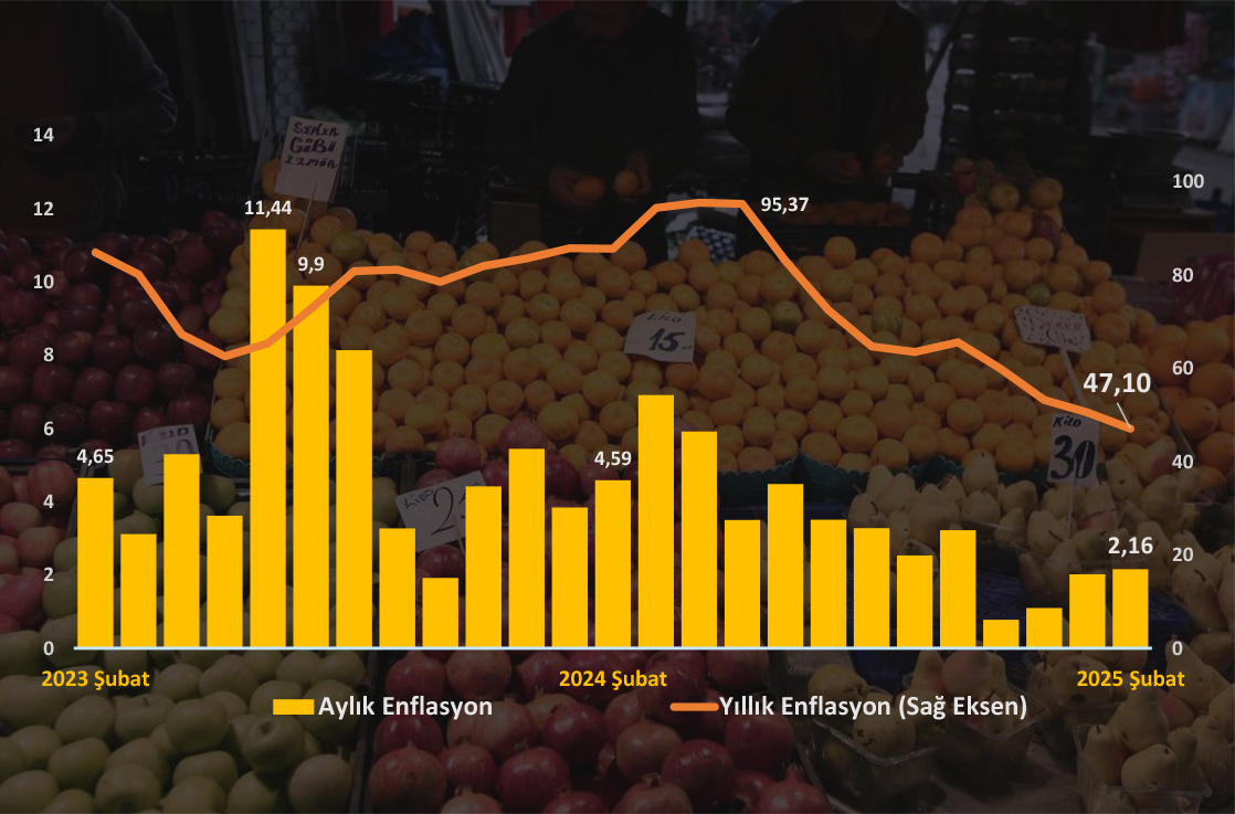 Türkiye İstatistik Kurumu’nun (TÜİK) verilerine göre Şubat ayında aylık bazda enflasyon %2.27, Aralık 2024’e göre iki aylık enflasyon %7.42; yıllık enflasyon ise %39.05 oldu. Türkiye’de Enflasyon Araştırma Grubu’na (ENAG) verilerine göre ise Şubat ayında enflasyon aylık bazda %3.37; yıllık enflasyon da %79.51 olarak gerçekleşti. Koç Üniversitesi Ekonomi Bölümü öğretim üyesi Selva Demiralp, “Enflasyonda Şubat ayından sonraki düşüş baz etkisi nedeni ile daha yavaş olacak. Bu durum TCMB’nin faiz indirimlerini ağırdan alması için önemli bir sebep” yorumunu yaptı.