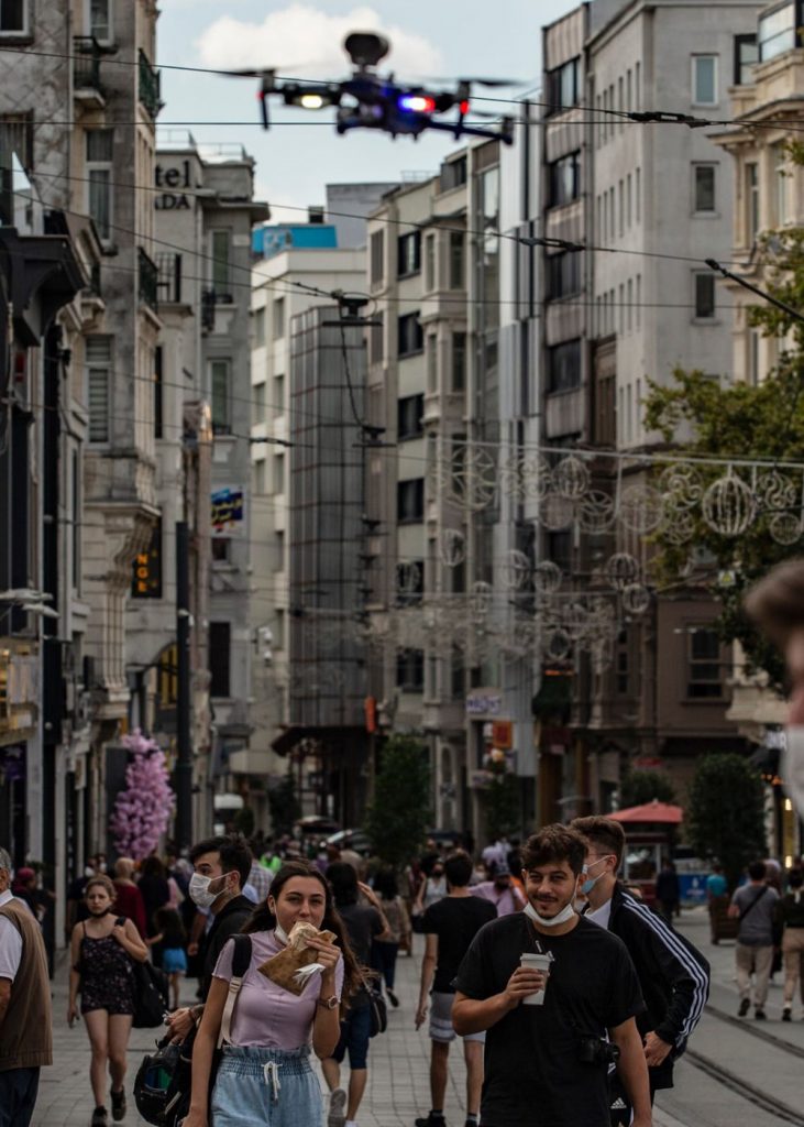 İstiklal Caddesi üzerinde uçurulan drone’dan “Corona virüs salgını ile mücadelede yeni bir döneme girmiş bulunuyoruz. Artık kontrollü sosyal hayat dönemindeyiz. Tüm kurallara hassasiyetle uyalım, maskelerimizi takalım, bu dönemi hep beraber aşacağız” şeklinde anonslar yapıldı.