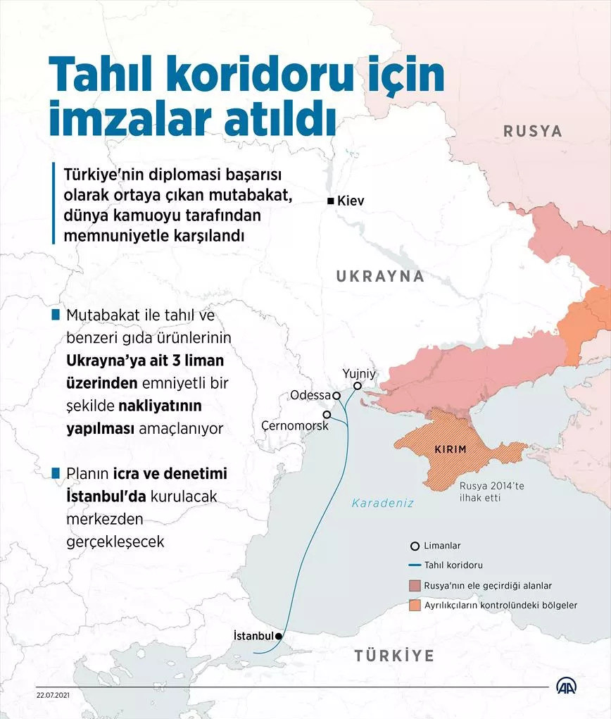 Cumhurbaşkanı Recep Tayyip Erdoğan’ın himayelerinde, bugün İstanbul’da, Türkiye, Rusya, Ukrayna ve Birleşmiş Milletler (BM) arasında “Tahıl ve Yiyecek Maddelerinin Ukrayna Limanlarından Emniyetli Sevki Girişimi Belgesi” imzalanmıştı.