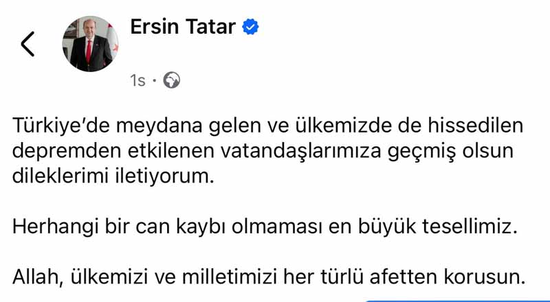 Tatar, mesajında “Allah, ülkemizi ve milletimizi her türlü afetten korusun” ifadelerine yer verdi.