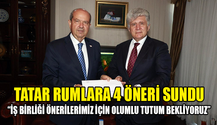 “Kıbrıs Türk Tarafı, Anavatan Türkiye Cumhuriyeti’nin de tam desteğiyle yapıcı ve pro-aktif siyasetinin ve iradesinin somut bir örneğini daha iş birliği önerileriyle masaya koymuştur” diyen Cumhurbaşkanı Tatar, “Ben uzlaşıdan ve diplomasiden yana bir Lider olarak, faydasının yaşamın her alanında hissedileceği bu iş birliği önerilerimizin bir an önce hayata geçirilmesi konusundaki kararlılığımı bir kez daha yinelemek istiyorum” ifadelerini kullandı.