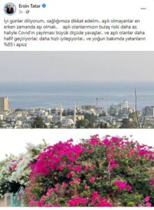 Tatar, Girne ve dağ manzarası fotoğrafları ile birlikte aşılı olanların bulaş riskinin daha az olduğuna ve covid-19’un yayılmasının büyük ölçüde yavaşlayacağına dikkat çekerken, aşılı olanların hastalığı daha hafif geçirerek daha hızlı iyileşeceğini belirtti.