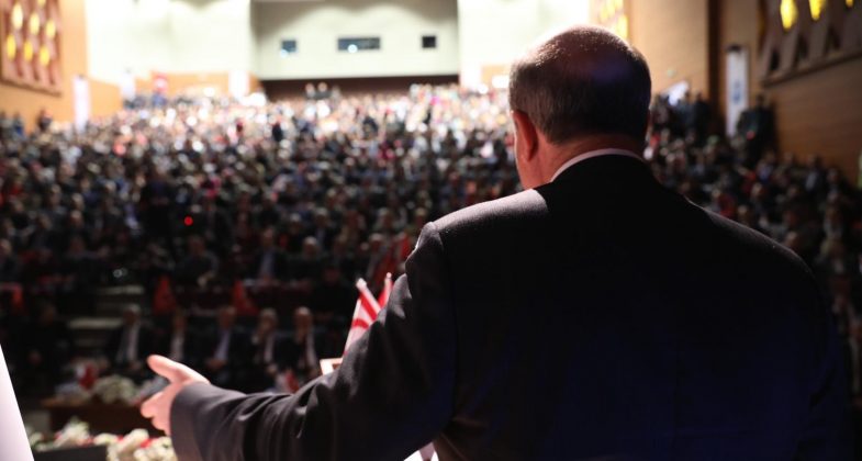 Başbakan Tatar’ın konuşması sırasında salonda KKTC ve TC bayrakları da sallandı.