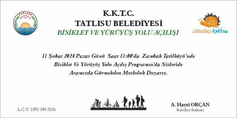 Tatlısu Belediyesi, 11 Şubat 2024 Pazar Saat 10:30’da bisiklet ve yürüyüş yolu açılışının yapılacağını duyurdu.