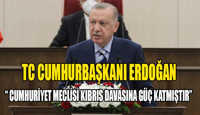 Cumhuriyet Meclisi’nin Kıbrıs Türk halkının azmini mücadelesini yansıtan bir kurum olduğunu kaydeden Erdoğan, “Kıbrıs Türkü karşılaştığı onca zorluğa rağmen haklı davasına inancını asla kaybetmemiştir. Cumhuriyet Meclisi Kıbrıs davasına güç katmıştır” dedi.