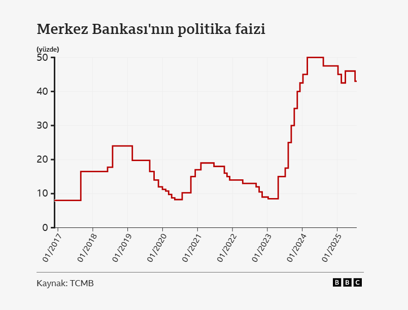 Türkiye Cumhuriyet Merkez Bankası (TCMB) faizi beklentilerin üzerinde 300 baz puan indirdi. Piyasada ortalama beklenti 250 puanlık indirim olacağı yönündeydi. Böylece politika faizi %46 seviyesinden %43 seviyesine indirildi. TCMB, gecelik vadede borç verme faiz oranını %49’dan %46’ya, gecelik vadede borçlanma faiz oranını da %44.5’ten %41.5’e çekti. Bu, TCMB’nin Mart’tan sonra ilk faiz indirimi oldu. İstanbul Belediye Başkanı Ekrem İmamoğlu’nun tutuklanmasının ardından (Nisan ayında) politika faizi %46 seviyesine yükseltilmişti. İndirimlerin yeniden başlamasının, halkın dövize yönelik eğilimini artırması bekleniyor.