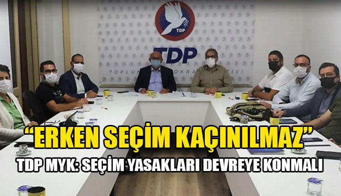 Toplumcu Demokrasi Partisi Merkez Yönetim Kurulu (TDP MYK) ülkenin içinde bulunduğu durumda erken seçimin kaçınılmaz olduğunu belirterek, erken seçim tarihinin bir an önce belirlenmesi ve seçim yasaklarının hemen devreye konması gerektiğini vurguladı.