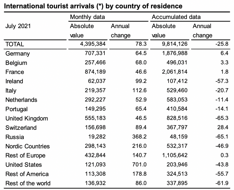 Temmuz ayında İspanya’ya en çok ziyaretçi gönderen ülke 874 binle Fransa olurken, onu 707 binle Almanya, 555 binle İngiltere ve 292 binle Hollanda takip etti.