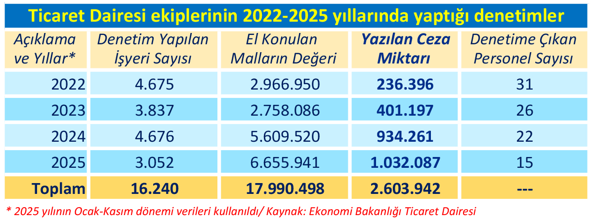 Ekonomi ve Enerji Bakanlığı’na bağlı Ticaret Dairesi ekipleri, Ocak-Kasım 2025 döneminde 3 bin 052 işyerini denetledi. Denetimlerde el konulan malların mali boyutu ile kesilen ceza tutarı 2024 yılına kıyasla artarken, denetimlerde düşüş olduğu görüldü. Dairenin açıkladığı verilere göre, 2025’teki denetimlerde 6 milyon 655 bin 941 liralık mal müsadere edilirken, bu miktarın 2024’ün aynı dönemine göre %29.44 oranında daha fazla olduğu hesaplandı. Geçen yılın 11 aylık döneminde 5,1 milyon liralık mala, 12 aylık dönemde ise 5,6 milyon liralık mala el konulmuştu.