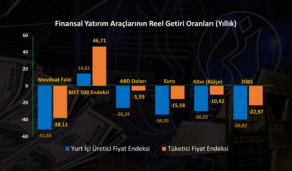 Herhangi bir yatırımdan elde edilen nominal (görünen) getirinin gerçekleşen enflasyondan arındırılmış hali olan reel getirinin Türk Lirası brüt mevduat faizinde ise rekor oranda eridiği dikkati çekti. TL mevduat faizi TÜFE ile indirgendiğinde yatırımcısına yıllık bazda %38.11; altı aylık bazda %9.58; aylık bazda ise %1.63 oranında kaybettirdi. Yİ-ÜFE’de de yıllıkta %51.65; altı aylıkta %17.31 oranında kaybettiren mevduat faizi, Kasım ayında şaşırtıcı şekilde %0.46 reel getiri sağladı.