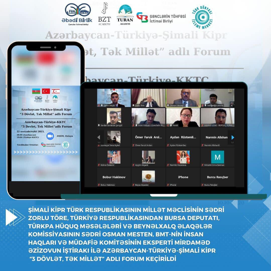 Meclisten yapılan açıklamaya göre, Azerbaycan-Türkiye-Kuzey Kıbrıs Bölgesel Entegrasyon Seminer Serisi çevrim içi oturumla gerçekleşti. Zoom platformu üzerinden Azerbaycan “Ebedi Birlik” Gençlik Kamu Birliği’nin düzenlediği BZT Akademi, Turan Akademi, Azerbaycan Gençliğe Katkı Kamu Birliği ve “Türk Dünyası İzleme Merkezi’nin” destekleriyle; Azerbaycan-Türkiye-Kuzey Kıbrıs “3 Devlet, Tek Millet” Forumu yapıldı. Açıklamaya göre etkinliğe, KKTC’den Meclis Başkanı Zorlu Töre, Türkiye’den Ak Parti Bursa Milletvekili Osman Mesten, BM İnsan hakları ve Savunma Komite üyesi Mirdamed Azizov ve diğer STK temsilcileri ile genç diplomatlar yer aldı.