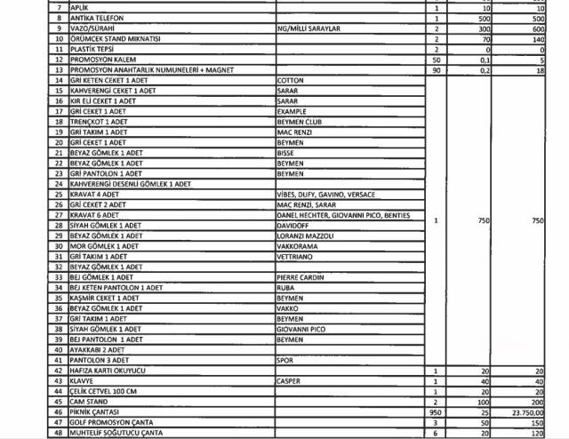 Malların markası, modeli, adedi, birim fiyatı tek tek sıralandı. Sözcü’de yer alan habere göre, altı şirkete ait mallar arasında büro mobilyaları ve bilgisayarların yanında, dünyaca ünlü markaların ceketleri, kravatları gömlekleri, antika mobilyalar, vazolar heykeller bulunuyor.