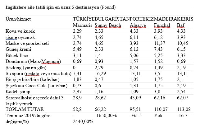 Post Office tarafından yapılan araştırmaya göre Pound’un Avro karşısında değer kazanması medeniyle İngilizler için bütün ülkelerde tatil ucuzlarken en çok ucuzlayan yer Türkiye’nin Marmaris bölgesi oldu. Aile tatilinde ucuzlukta Türkiye Marmaris’i Bulgaristan’ın Sunny Beach, Kıbrıs’ın Baf ve Portekiz’in Algarve’si izliyor.