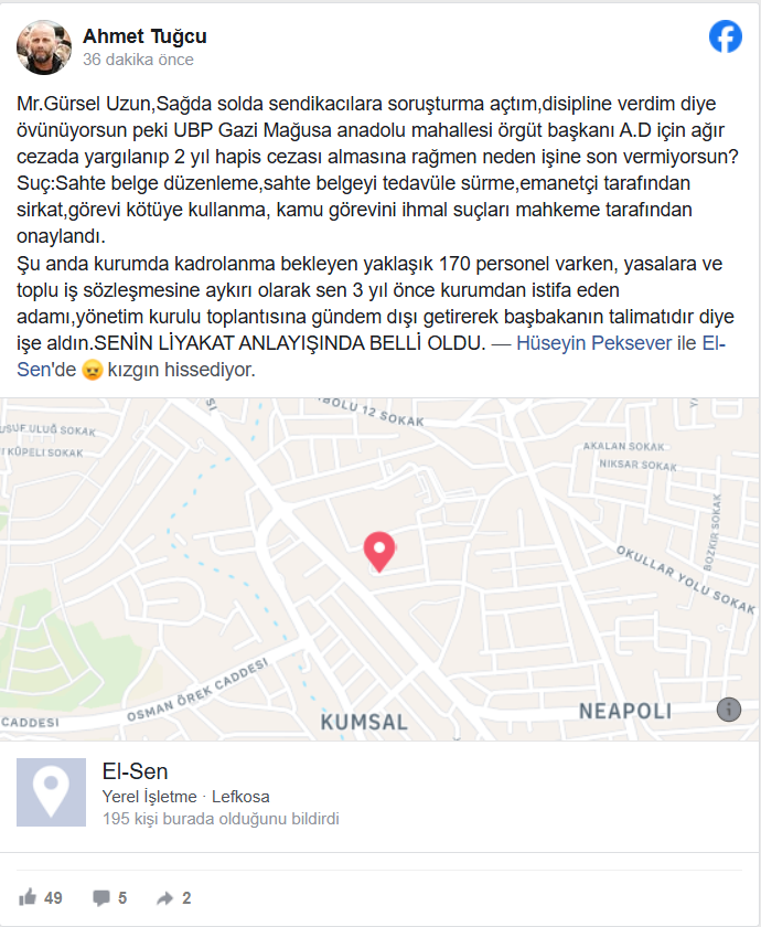 Elektrik Kurumu Çalışanları Sendikası (El-Sen) Genel Başkanı Ahmet Tuğcu, UBP Gazi Mağusa Anadolu Mahallesi Örgüt Başkanı A.D.’nin ağır cezada yargılanıp 2 yıl hapis cezası almasına rağmen işine son verilmemesine tepki gösterdi.
