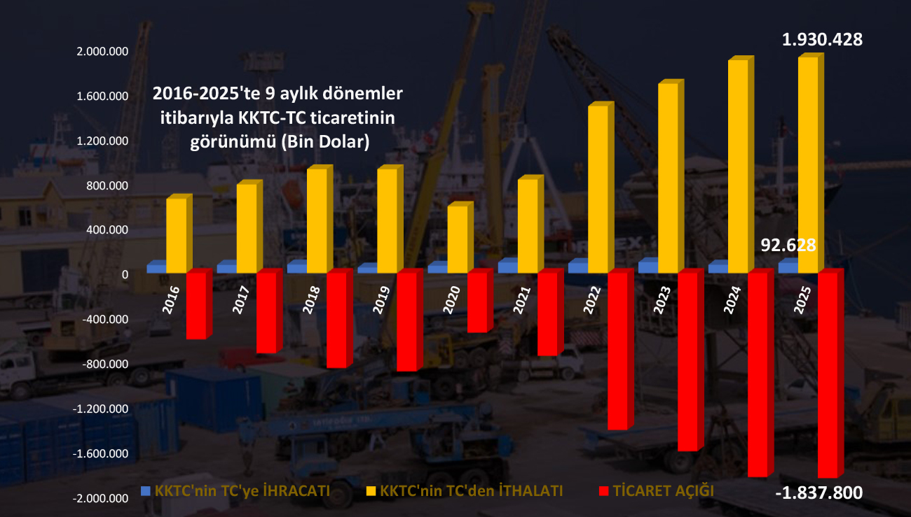 TÜİK verilerine göre, dokuz aylık dönemler itibarıyla ticaret açığı bir yıl öncesine göre %0.62 oranında artışla 1 milyar 826 milyon dolardan, 1 milyar 837 milyon dolara uçtu. TC-KKTC ticaretinde son 10 yılın rakamları KKTC aleyhine derin bir uçurum varlığına da işaret ediyor. 2016-2025 yılları arasında (9. aylar itibarıyla) KKTC, TC’ye toplam 794 milyon dolarlık mal satarken, 11,8 milyar dolarlık mal aldı. Veriler, bu süreçte KKTC’nin ticaret açığının 10,9 milyar doları geçtiğini de gösteriyor.