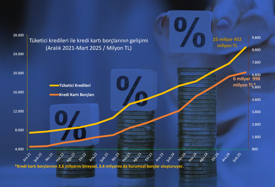 Tüketici kredileri Ekim 2021’de 7 milyar lirayı geçerek hızlı bir artış serisi yakaladı. Mayıs 2022’de 8 milyar, Aralık’ta ise 9 milyar sınırı aşılırken, daha sonraki yükselişler TL’nin ağır değer kayıpları ve ekonominin daha da kötüleşmesi nedeniyle çok daha hızlı oldu. Mart 2023’te 10 milyarın üzerinde olan tüketici kredileri iki yıllık sürede %260’lık bir uçuşla 25 milyarı geçti. Mart 2024’te 17 milyar lira civarında olan kredilerin, bir yılda 8 milyarlık (%47) yükseliş göstermesi de dikkati çekti.