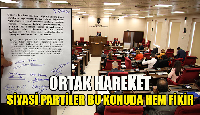 KKTC Cumhuriyet Meclisi’nde temsil edilen tüm siyasi partiler Güney Kıbrıs Rum Yönetimi’ne Yeşil Hat Tüzüğü’ndeki hakların yasaklayıcı bir mantıkla sınırlandırılması anlamını taşıyan bu uygulamaya derhal son vermesi ve AB yetkililerine de Rum tarafının bireylerin geçiş kapılarından geçiş hakları konusunda salgın öncesindeki duruma geri dönmesi konusunda derhal gereken inisiyatifi alması konusunda çağrı yapar.”