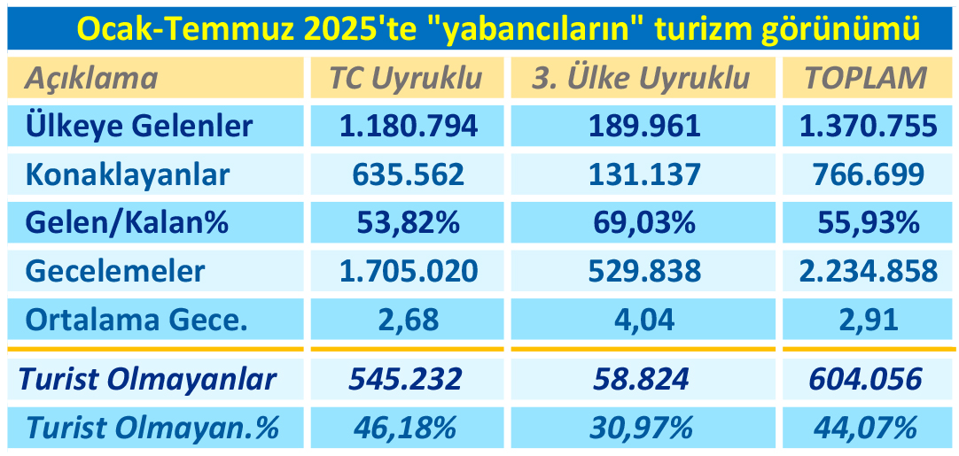 Turizm Bakanlığı’nın açıkladığı veriler, ilk yedi ayda otellerde konaklayanların 635 bin 562’sinin Türkiye Cumhuriyeti uyruklu, 131 bin 137’sinin de Üçüncü Ülke uyruklu olduğu saptandı. 545 bin 232 TC uyruklu ile 58 bin 824 üçüncü ülke uyruklunun ise ülkeye turizm amacıyla gelmediği belirlendi. Tüm ziyaretçilerin %44.07’lik kısmını oluşturan bu kişilerin oranı geçen yıl %41 (474 bin 735 kişi) olarak hesaplanmıştı. Turist olmayan 604 bin 056 kişinin öğrenci, görevli, kayıtlı işçiler ile kayıtsız işçiler olduğu vurgulanıyor.