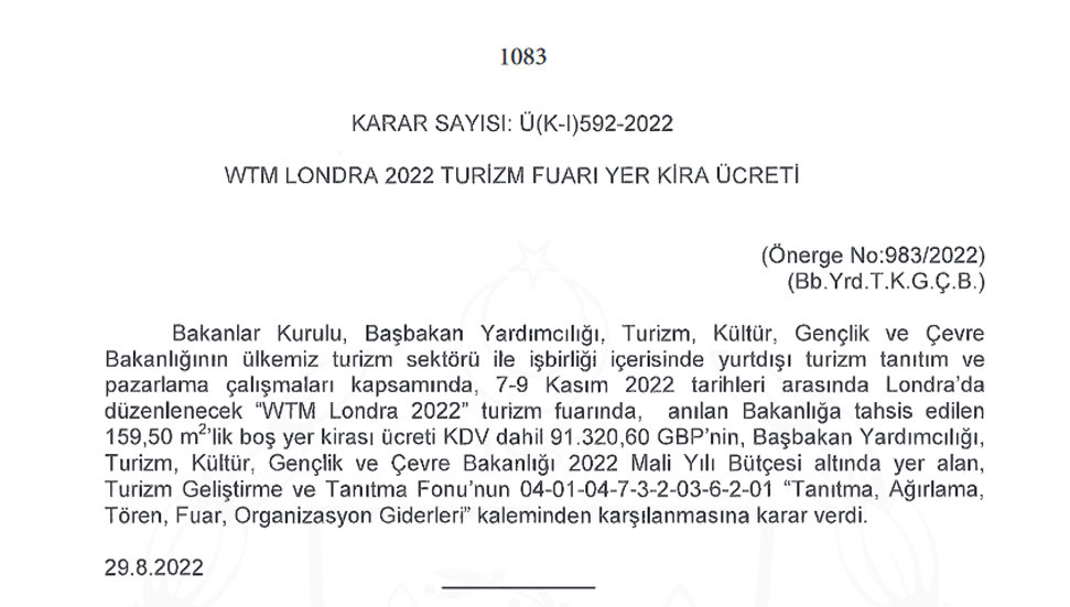 Turizm, Kültür, Gençlik ve Çevre Bakanlığı, “WTM Londra 2022” turizm fuarına katılacak. Resmi Gazete’de yer alan karara göre bakanlık, ‘159,50 m2’Iik boş yer kirasına 91 bin 320,60 sterlin ödeyecek.
