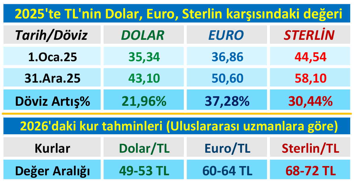 Beklenmedik bir şok yaşanmadığı sürece, 2026 sonunda Dolar/TL’nin 50-53 TL bandına, Euro/TL ile Sterlin/TL’nin ise bunun çok üzerine çıkması bekleniyor. Bu tablo Türkiye için “denge arayışı” olarak okunurken, KKTC için alım gücü kaybı, gelir dağılımı bozulması ve hayat pahalılığının derinleşmesi anlamına geliyor. 2026, KKTC’nin Türk Lirası’nın değer kaybını çok sert hissettiği bir yıl olmaya aday.