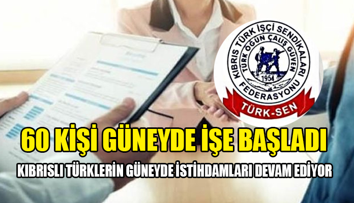 “TÜRK-SEN ile SEK Federasyonlarının yaptığı çalışmalar sonucunda güneyde çalışmak isteyen ve TÜRK-SEN’e müracaat eden Kıbrıslı Türkler, başta Turizm sektöründe olmak üzere aralık ayında iki grup 130 kişi bunların arasından 60 kişi işe başlamış, diğer 40 kişi ise önümüzdeki günlerde işlerine başlayacakları tarafımıza bildirilmiştir.