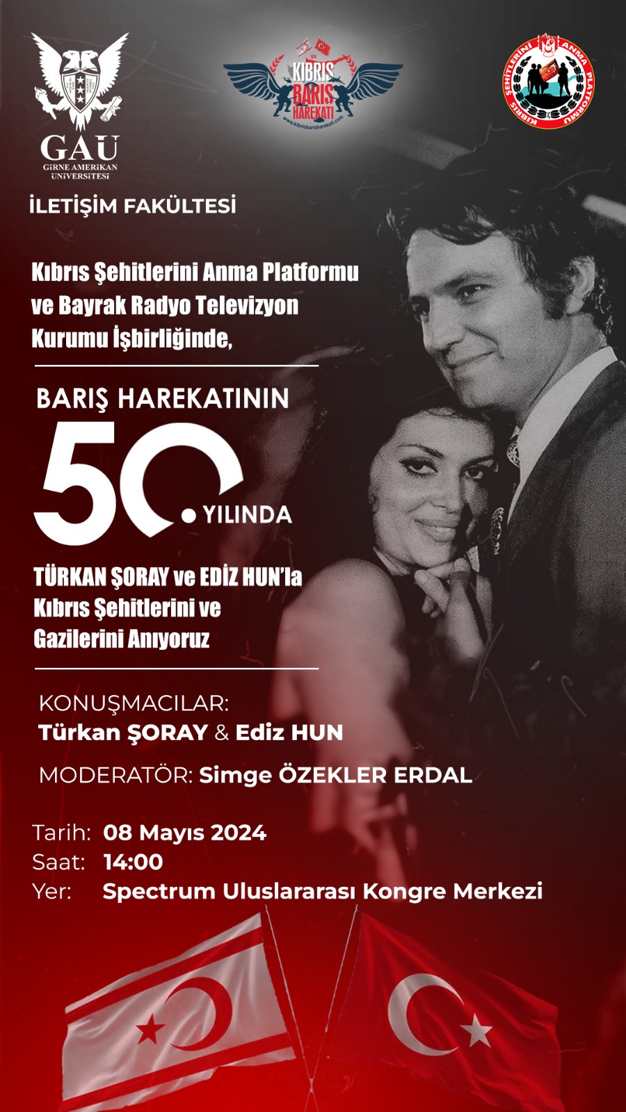 GAÜ İletişim Fakültesi Dekanı Prof. Dr. Neriman Saygılı, üniversitede yapılacak olan etkinlik ile ilgili olarak verdiği bilgide şu notları paylaştı: “Sinemamızın olduğu kadar, hem kişisel hem de toplumsal hafızamızın simge sanatçıları Sayın Türkan Şoray ile Sayın Ediz Hun; Kıbrıs Şehitlerini Anma Platformu ve Bayrak Radyo Televizyon Kurumu (BRT) işbirliğinde düzenlenmiş ‘Barış Harekatı’nın 50.Yılında Türkan Şoray ve Ediz Hun’la Kıbrıs Şehitlerini ve Gazilerini Anıyoruz’ programı dolayısıyla 6-10 Mayıs tarihleri arasında Kıbrıs Türk halkı ve tüm sevenleri ile buluşmak üzere ülkemizde olacaklardır. Değerli sanatçılarımızı adamızda görmek, ayrıca üniversitemizde ağırlamaktan da büyük onur ve mutluluk duyacağız.”