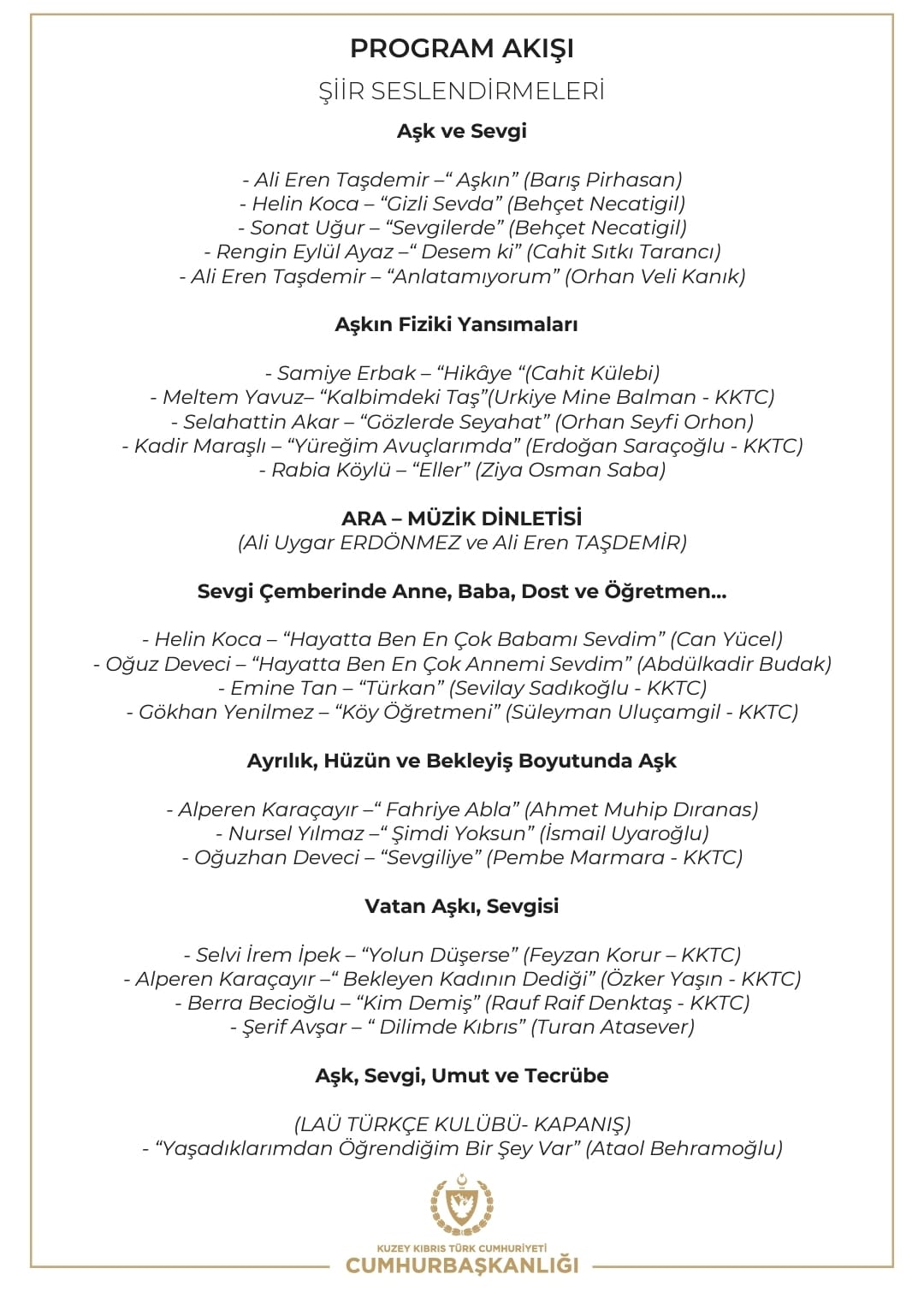 Cumhurbaşkanlığından verilen bilgiye göre, danışmanlığını Prof. Dr. Oğuz Karakartal’ın yaptığı etkinlikte, Lefke Avrupa Üniversitesi Türkçe Kulübü öğrencileri “Türkçenin Sözcükleri Aşka Düşünce” adlı dinletide 22 şiir okuyacak. Müzikle harmanlanmış dinleti, iki bölümden oluşacak.