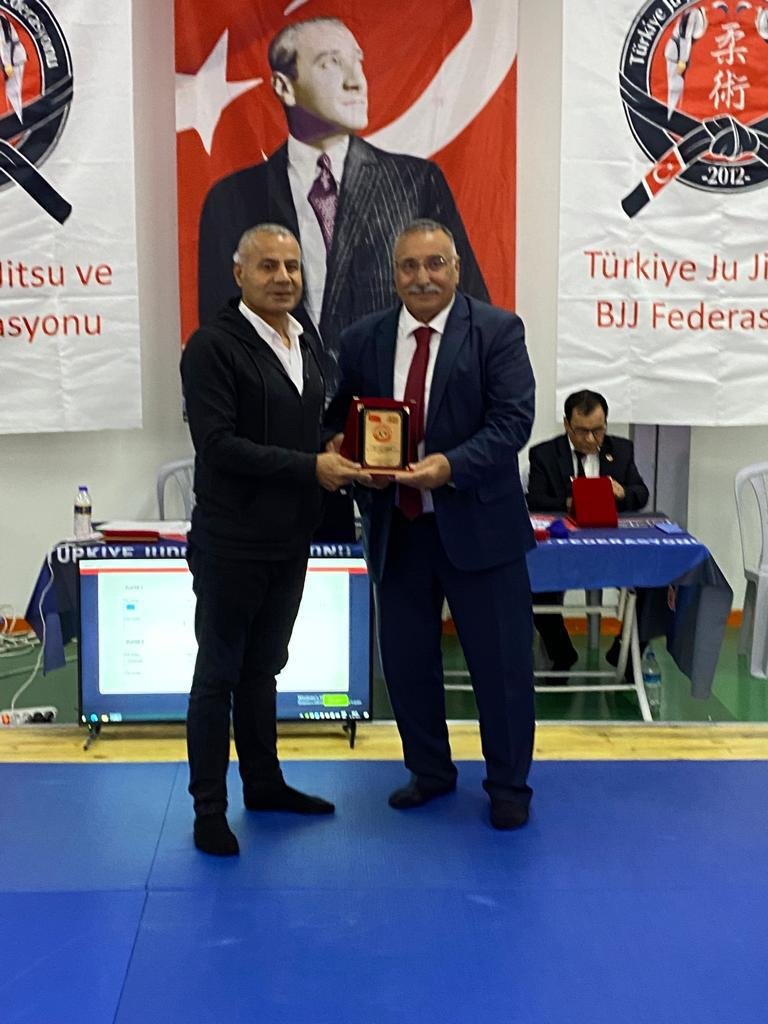 Türkiye Ju Jitsu şampiyonasında TC jiu jitsu federasyon başkanı Semih Işık, Kempo Savuma Sporları başkanı Mehmet İngenç’e plaket verirken, başkanı Mehmet İngenç’de başkan Semih Işık, başkan yardımcısı Bünyamin Er, Genel Sekreter Metehan Şahin’e plaket verdi.