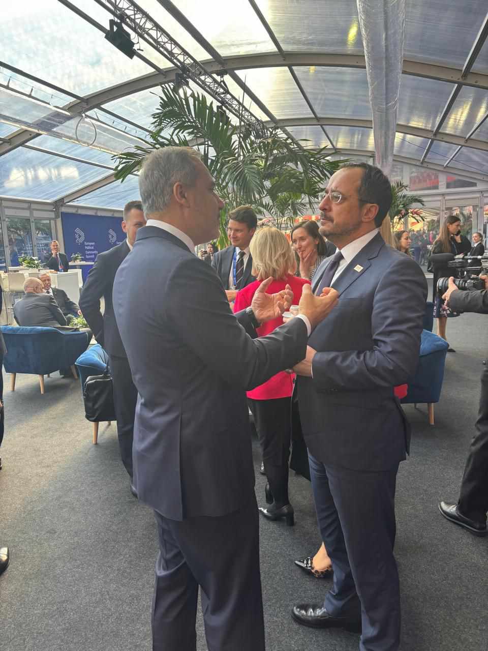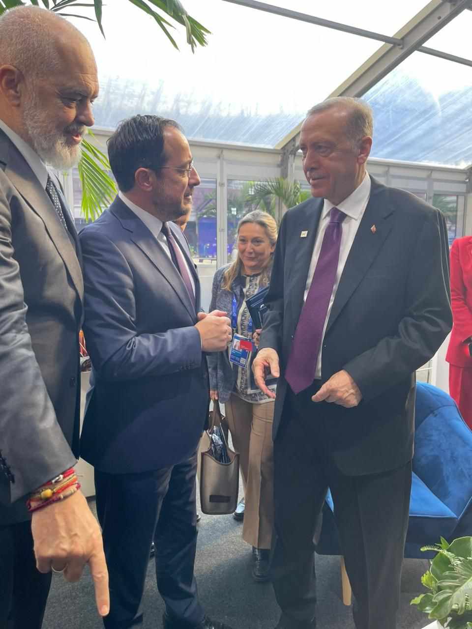 Türkiye Cumhurbaşkanı Recep Tayyip Erdoğan ile Rum Lider Nikos Hristodulides’in Budapeşte’de bir araya gelmesi kamuoyunda büyük yankı uyandırdı. Resmi formatta olmasa da Türkiye Cumhuriyeti Cumhurbaşkanının “Kıbrıs Cumhuriyeti” sıfatıyla Budapeşte’de bulunan Hristodulides’le buluşması Kıbrıs sorununa ilişkin sürpriz bir gelişme olarak nitelendiriliyor. Bu arada görüşmenin yeni görüntüleri de Rum medyasına yansımaya devam ediyor. Bu kez Alphnews’in yayınladığı yeni fotoğraflarda Yunanistan Başbakanı Mitçotakis’in de aynı masada olduğu görülüyor. Ayrıca Dışişleri Bakanı Hakan Fidan’la Hristodulides’in ayaküstü sohbetini yansıtan fotoğraflar da servis edildi. Buluşma fotoğraflarında Arnavutluk Başbakanı da bulunuyor.
