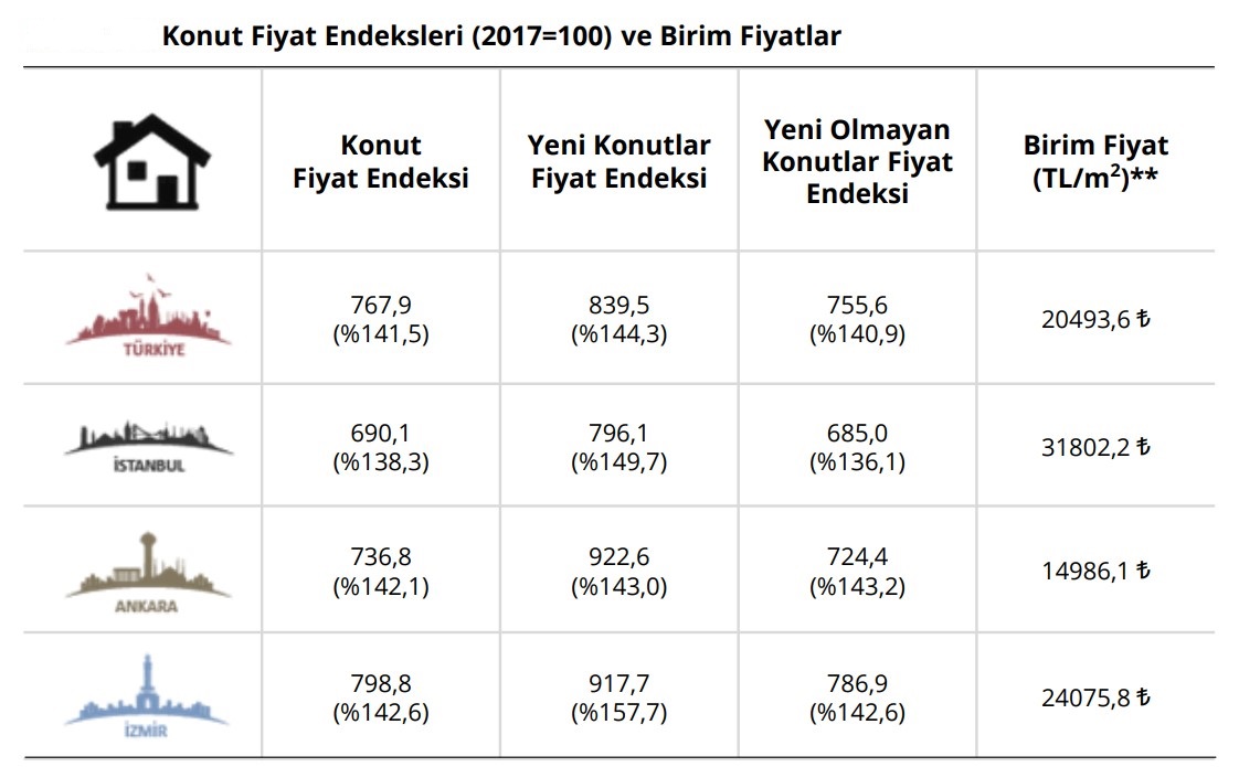 Türkiye genelinde metrekare fiyatları Ocak ayında 18 bin 682 TL iken Şubat’ta 20 bin 493 TL’ye yükseldi. Böylece, ülke genelindeki 100 metrekare bir evin ortalama fiyatı Şubatta 2 milyon 049 bin 300 TL’ye ulaştı ve ilk kez 2 milyon TL sınırı aşılmış oldu. Verilere göre, yeni konut fiyat endeksi yıllık bazda %144.3; yeni olmayan konutlar fiyat endeksi ise %140.9 oranında gerçekleşti.