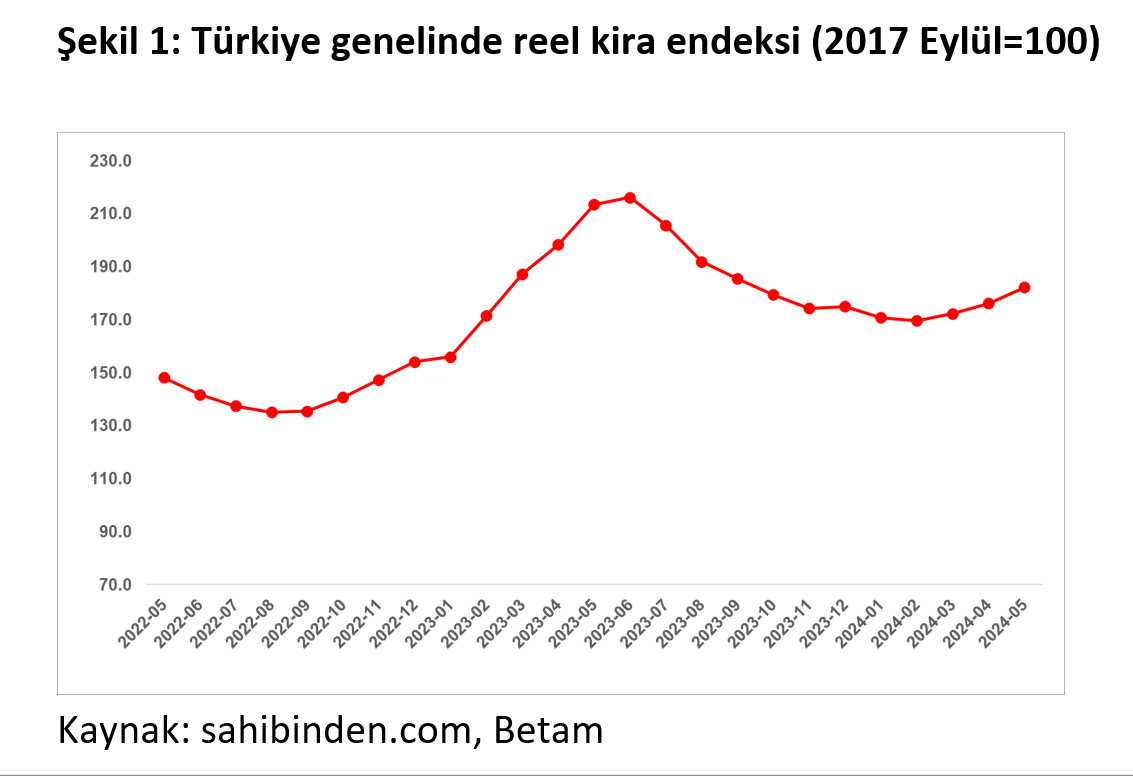 Türkiye genelindeki reel kira endeksi Haziran 2023’te zirve yaptıktan sonra Mart 2024’e kadar düşüş eğilimini sürdürmüştü