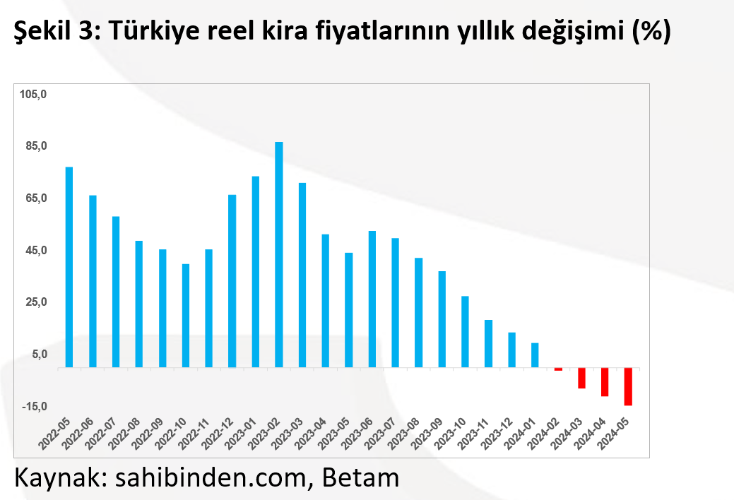 Sahibinden Kiralık Konut Piyasası Görünümü: Haziran 2024 raporuna göre, Türkiye genelinde ve üç büyükşehirde Nisan’dan Mayıs’a cari kira fiyatlarındaki artışın aylık enflasyondan daha yüksek olması sonucu enflasyondan arındırılmış (reel) kira fiyatları arttı. Buna karşılık, ülke genelinde Mayıs ayı itibarıyla reel fiyatlarla kira ortalaması bir önceki yılın aynı ayı ile karşılaştırıldığında yüzde 14.6 daha düşük olduğu görülüyor.