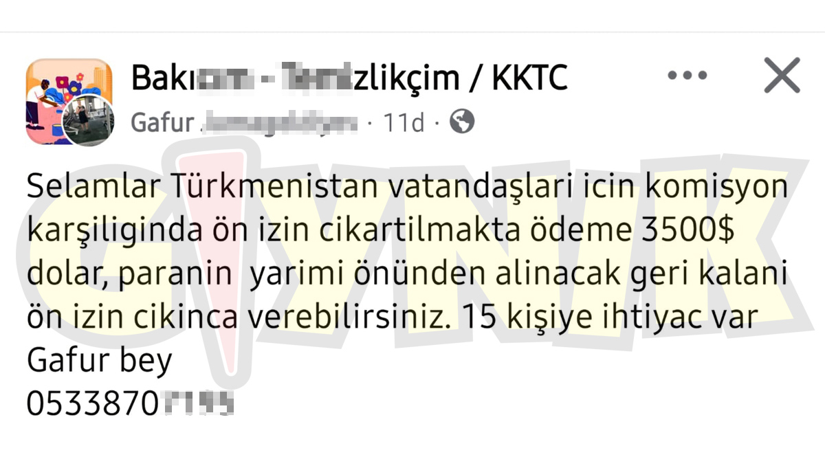 Çeşitli sosyal medya platformlarında, komisyon karşılığında ön izin çıkartabileceğini iddia eden kişiler görülüyor. Kısa bir süre önce Facebook’ta yapılan bir paylaşım muhabirlerimizin dikkatini çekti. Paylaşımda “Türkmenistan” vatandaşları için 3 bin 500 dolar komisyon karşılığında ön izin alınabileceği belirtildi. Telefon numarası da verilen paylaşımda, paranın yarısının peşin, geri kalanının ise ön izin çıkarıldıktan sonra ödeneceği ifade ediliyor. Türkmenistan asıllı biri tarafından yapıldığı anlaşılan paylaşımda ayrıca bu iş için 15 kişiye ihtiyaç duyulduğu vurgulanıyor.