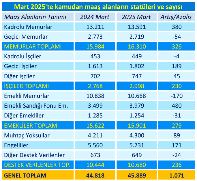 Resmi veriler, son bir yılda kamudan çek alanların sayısında bin 354 (1.354) kişilik artış olduğunu gösteriyor. Ancak, ölüm, geçicilikten kadroluya dönüş veya emeklilik nedeniyle 283 kişi maaş listesinden düşerken, kaba hesapla bir yıldaki artış bin 071 (1.071) kişi oldu. Son yıllarda “partizanlıkla” anılan “sözleşmeli” ve “geçici” istihdamındaki artışın Mart 2024-Mart 2025 periyodunda da sürdüğü görüldü. Özellikle geçici işçi sayısının bir yılda %12 oranında artması dikkati çekti.