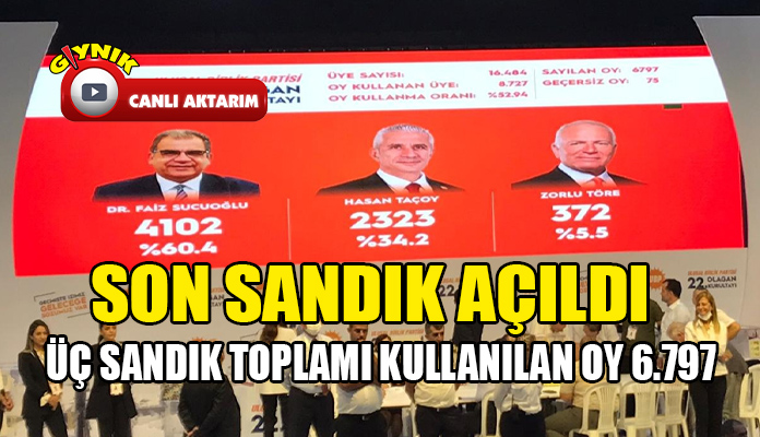 Saat 21.16 itibari ile üçüncü sandığın da sayımı tamamlandı. Ulusal Birlik Partisi’nin 22. Olağan Genel Kurultayı’nda ilk iki turun birincisi Faiz Sucuoğlu olurken üçüncü sandıktan da Faiz Sucuoğlu birinci çıktı.