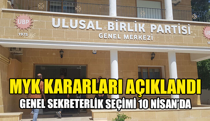 2-MYK, yapılan değerlendirmeler sonucu UBP Genel Sekreterliği seçiminin 10 Nisan’da toplanacak Parti Meclisi’nde yapılmasını öneren Genel Başkan’a onay verirken Parti Olağan Kurultayı, ara seçim, yerel seçimler, milletvekilliği erken seçimi konularının yaşanması olası gelişmeler ışığında değerlendirilmesinin gelecek toplantıda yeniden gündeme alınmasını benimsedi. Parti Genel Sekreterliği için aday olacakların seçim saatinden 48 saat öncesine kadar Parti Genel Başkanlığı’na başvurmaları gerektiği de MYK’da karar bağlandı. Genel Sekreterlik seçiminin kesin yer ve saati ile koronavirüs salgını gereği yapılacak düzenlemeler salon saptanması ile ilgili çalışmaların tamamlanmasının ardından önümüzdeki günlerde açıklanacaktır.
