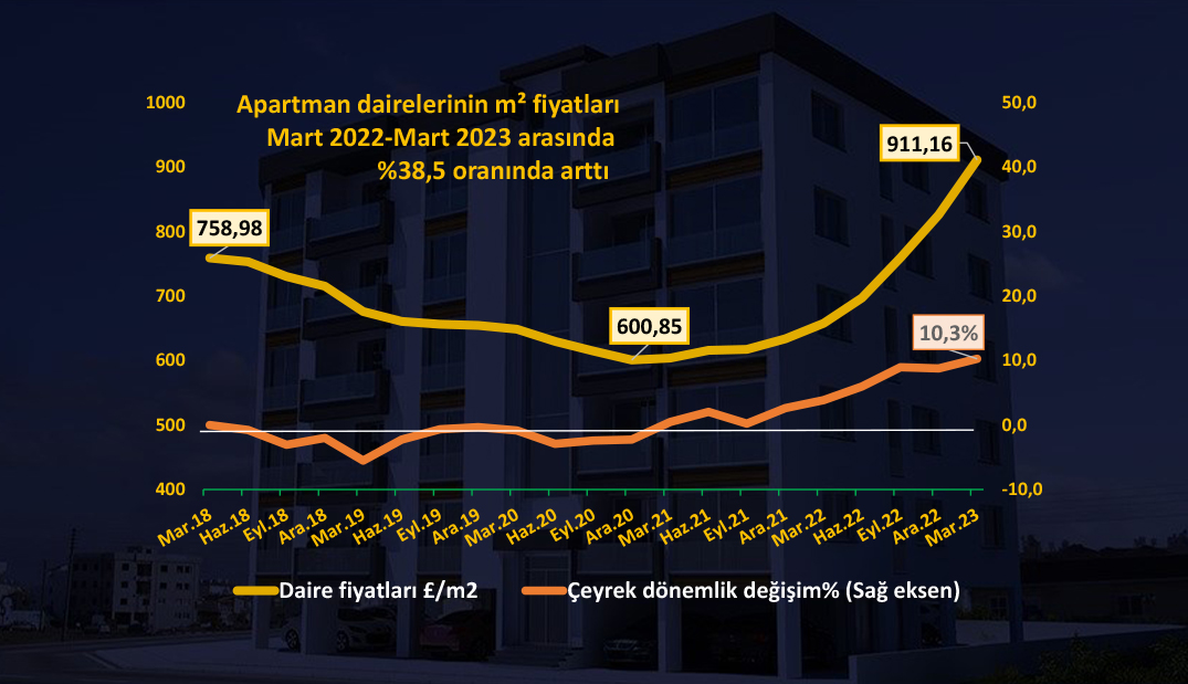 Kuzey Kıbrıs konut piyasasında Ocak-Mart 2023 periyodunda satılık apartman dairesi fiyatları sterlin bazında ortalama %10.27 oranında artış gösterdi. 2023’ün ilk çeyreğinde ülke genelinde satılık dairelerin ortalama metrekare satış fiyatı 911 sterlin değerinde hesaplandı. Aralık 2022 sonunda bu miktar 827 sterlin olarak belirlenmişti. Bu verilere göre, 100 metrekarelik bir dairenin ortalama satış fiyatı üç ay içinde 82 bin 627 sterlinden, 91 bin 200 sterline ulaştı. 100 metrekarelik bir apartman dairesinin Türk Lirası cinsinden ortalama fiyatı ise 1 milyon 900 binden, 2 milyon 316 bine çıktı. TL fiyatındaki astronomik artış, liranın sterlin karşısındaki değer kaybıyla da tetikleniyor.