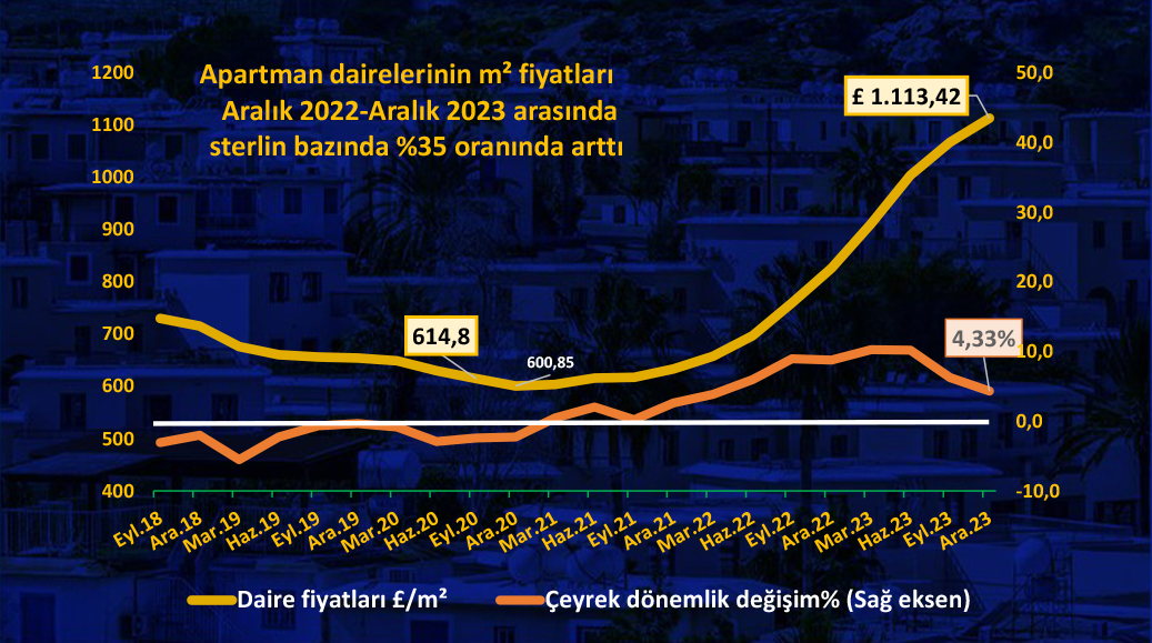 Ülkede satılık apartman dairelerinde en yüksek fiyatların İskele’de olduğu görüldü. İskele’de astronomik fiyatlı satılık apartman dairelerindeki yükseliş devam ederken, bir metrekare dairenin fiyatı yıllık bazda %42.2 oranında artışla 1,826 (bin 826) sterlini aştı. Girne’de yıllık artış %37.2 oranında olurken, metrekare satış fiyatı da 1,426 sterline (bin 426 sterlin) yükseldi. Mağusa’da ortalama metrekare fiyatı 1,018 sterlin ve Lefkoşa’da da 701 sterlin oldu. 2023’ün son çeyreğinde Lefkoşa’da artış serisinin %0.14’lük düşüşle sona erdiği de saptandı.