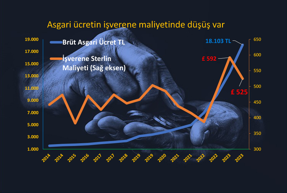 TİKEN’nin yaptığı hesaplamaya göre, dünkü kurlarla asgari ücretin işverene maliyeti yılbaşında belirlenen ilk asgari ücrete göre %11.41 oranında daha düşük. Ocak ayı başı itibarıyla 592 sterline denk gelen brüt asgari ücret dünkü kurlarla 525 sterlin olarak belirlendi. Bu hesaplamaya göre asgari ücretlinin maliyeti, tüm mal ve hizmetleri dövizle (özellikle sterlin) belirleyen işveren kesimine daha düşük bir bedele mal olacak. Türk Lirası’nın sterlin karşısında her değer kaybı da bu para cinsinden maliyeti daha da aşağıya çekecek.