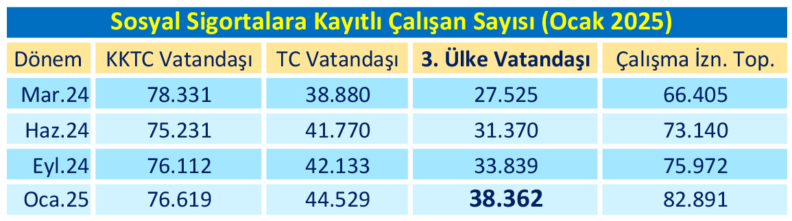 KKTC vatandaşlarının, sigorta sistemi içerisinde kayıtlı olan tüm çalışanlar içinde “azınlığa” düştüğünü gösteren 6 ay önceki rakamlar, “üçüncü ülkelerden” gelen işçilerin arttığına da işaret ediyor. Mart 2024’te 27 bin 525 üçüncü ülke uyruklu çalışanın sigorta kaydı olduğu görülürken, bu sayı 10 ay gibi kısa bir sürede %39.4 artışla 38 bin 361 kişiye uçtu. Artış hızına göre, bu çalışanların sayısının şu anda 42-43 bin bandında olduğu tahmin ediliyor. Neredeyse tümü az gelişmiş ve fakir ülkelerden “işçi ithali” yöntemiyle ülkeye taşınan bu çalışanların sigortalılar içindeki payı da %24’ü geçmiş durumda. Ayrıca, özellikle sendikal çevreler 10 binden fazla kaçak çalışan olduğunu da iddia ediyor.