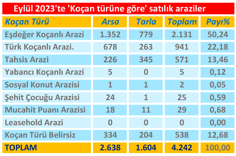 Satışa çıkarılan arsa ve tarlaların %50.24’üne denk gelen 2 bin 638 adedinin “eşdeğer koçanlı” olduğu dikkati çekiyor. Verilere göre %13.46 (571 adet) oranındaki “tahsisli araziler”; %12.68 (538 adet) oranındaki “koçan türü belirsiz araziler” ile toplamda %1.44’lük (61 adet) “diğer araziler” de eklenince, satılıkların %77.82’sinin “Türk koçanlı olmayan” arazilerden oluştuğu görülüyor. Eylül sonunda piyasada satılık pozisyonunda bulunan “Türk koçanlı” arazi sayısı 941’e adet olarak saptandı. Bu miktar tüm satılıkların %22.18’ine denk geliyor. “Mücahit puanıyla” sağlanan; “Şehit çocuklarına” verilen ve sosyal konut inşası için verilen birçok arazi de satılıklar arasında.
