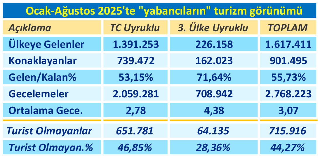 Turizm Bakanlığı verileri, sekiz aylık sürede ülkeye gelen yabancıların 715 bin 916’sının turistik tesislerde konaklamadığını gösteriyor. Verilere göre, 651 bin 781 TC uyruklu ziyaretçi ile 64 bin 135 üçüncü ülke uyruklu ziyaretçi turizm amacıyla gelmedi. Tüm ziyaretçilerin %44.3’lük kısmını oluşturan bu kişilerin oranı geçen yıl %39.8 (543 bin kişi) düzeyindeydi. Ülkede “kendi statülerine” göre konaklayanların öğrenci, görevli, kayıtlı-kayıtsız işçi ve kaçaklar olduğu belirtiliyor. Ocak-Ağustos arasında ülkeye gelenlerin 1 milyon 391 bin 253’ü TC uyruklu, 226 bin 158’i de diğer ülke uyruklu olarak kayıtlara geçti.
